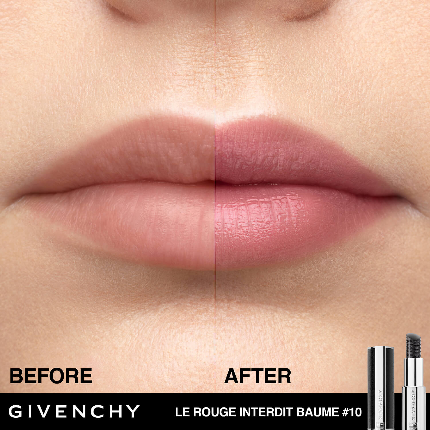El bálsamo labial Le Rouge Interdit Baume de Givenchy es fácil de usar, se puede aplicar durante todo el día, donde sea que estés y siempre que los labios necesiten un refuerzo de cuidado de la piel. Disponible en dos tonos: el natural N00, y N10 el icónico tono negro de Givenchy reinventado en una fórmula de bálsamo labial hidratante. Tono 10: utilízalo solo para hidratar e intensificar el color natural de tus labios. – Se puede usar como base para transformar y acentuar tu barra de labios.